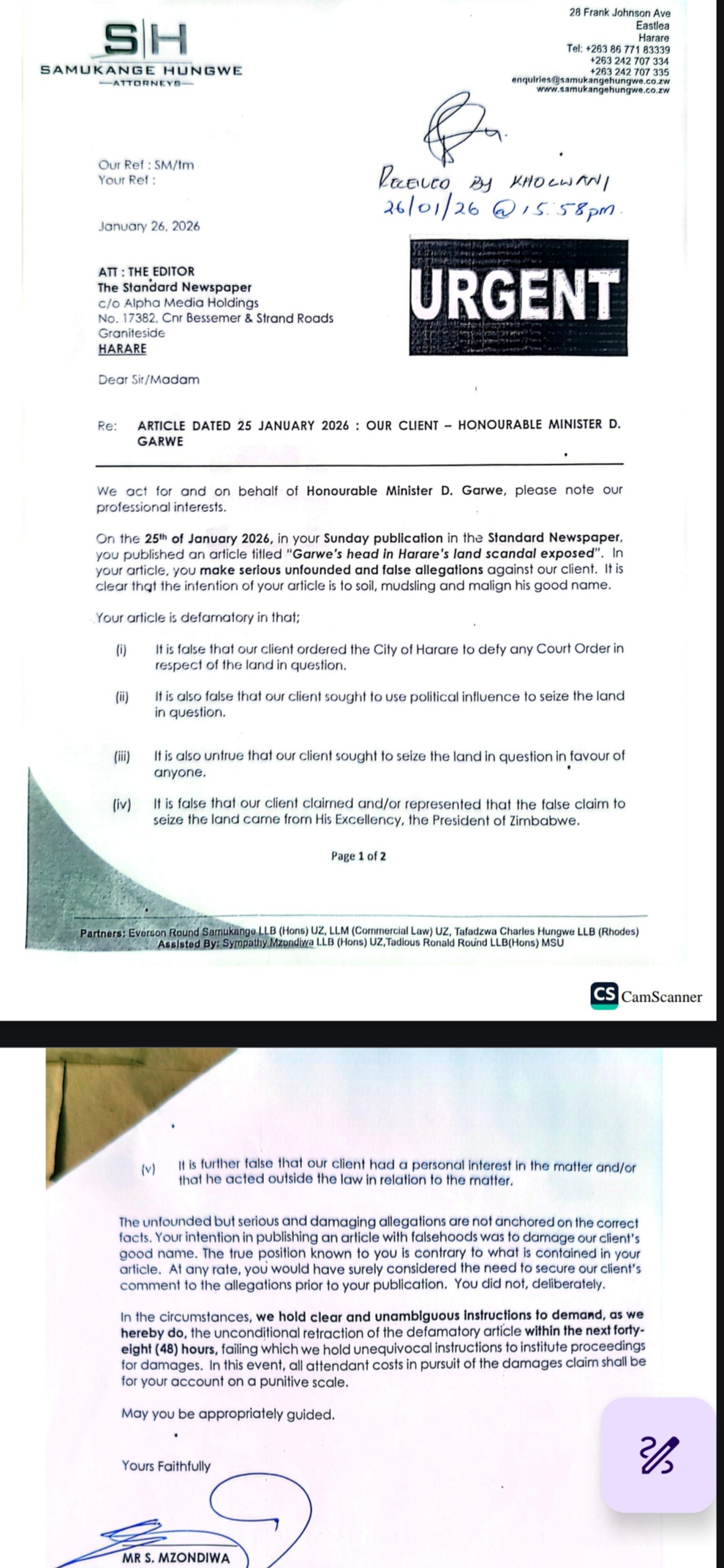 The letter from Samukange Hungwe Attorneys, dated January 26, 2026, escalates a bitter war over the narrative surrounding a disputed Newlands property deal. The lawyers state they “hold clear and unambiguous instructions to demand, as we hereby do, the unconditional retraction of the defamatory article within the next forty-eight (48) hours.”